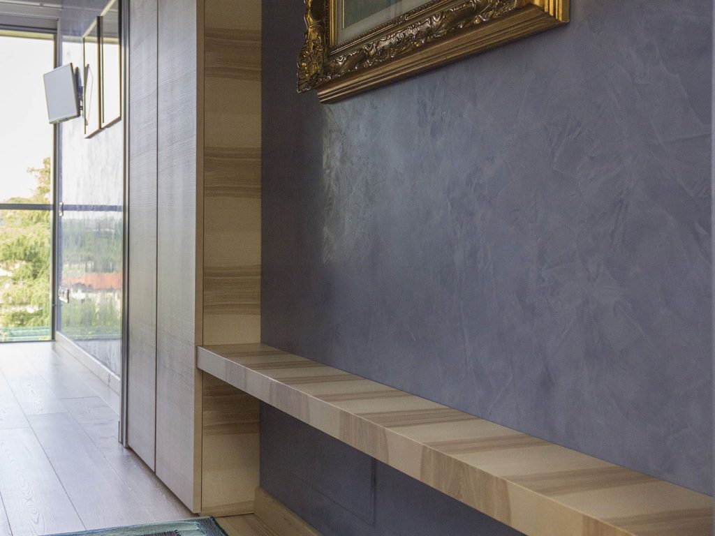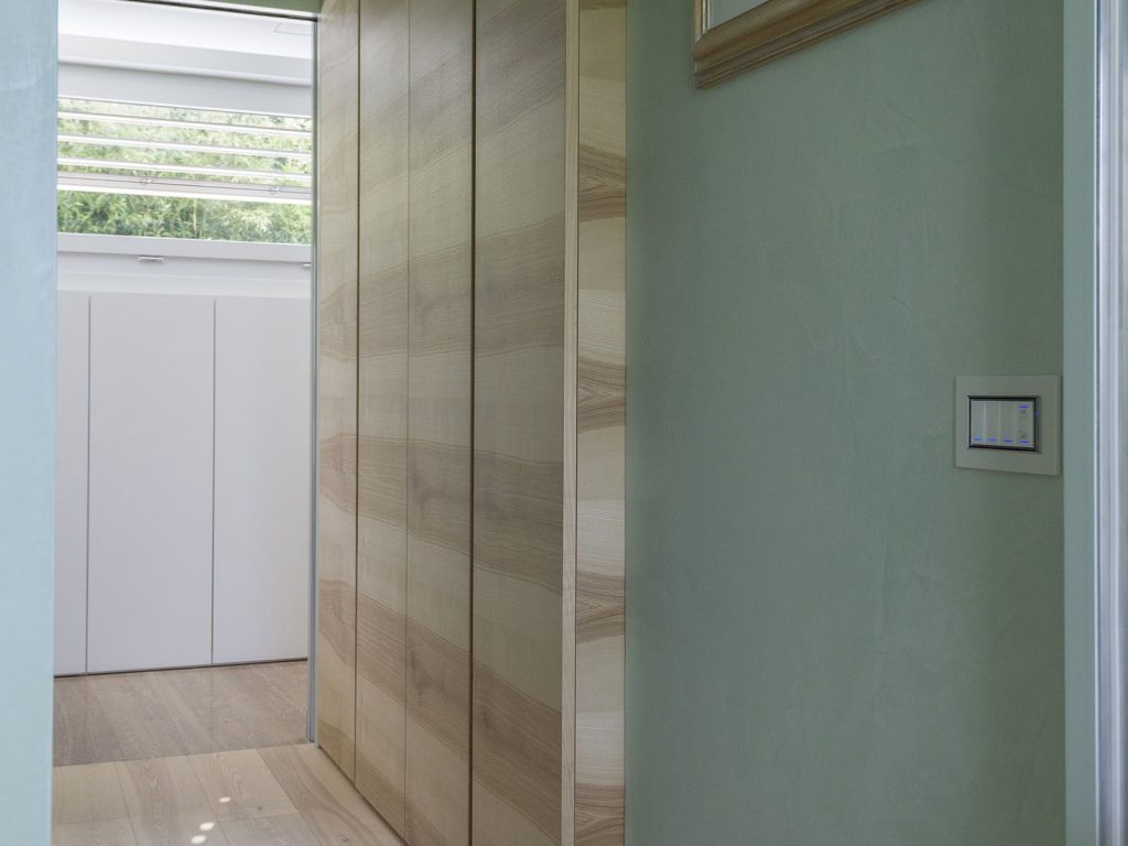 Le armadiature sono realizzate a muro quasi a diventare un unico volume con la parete. Le pannellature Boiserie della zona notte e dei bagni, grazie alla particolare essenza, non si limitano ad assolvere ad una funzione di contenimento, ma diventato elementi decorativi e disegnano le superfici dei muri.