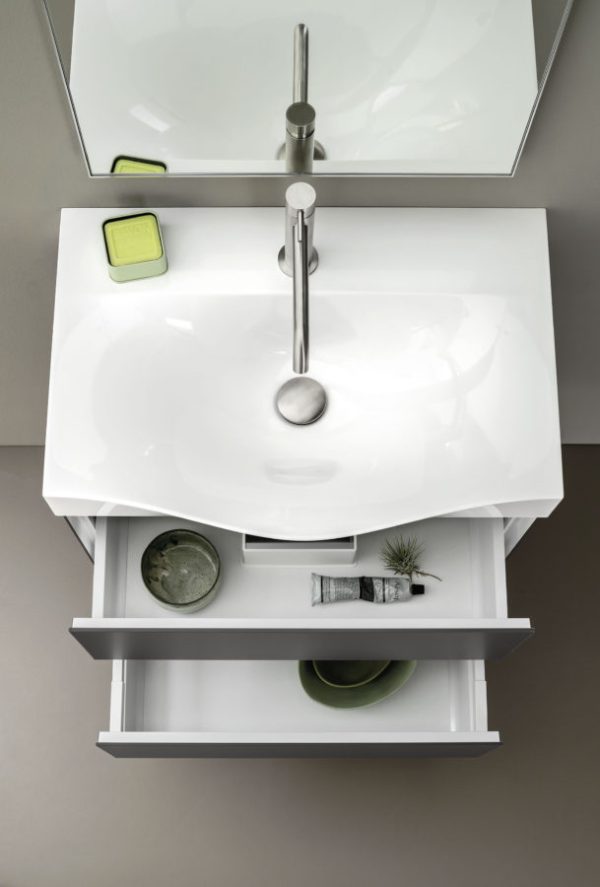 Riva Architettura propone una composizione mobile bagno moderno, nitido e dall’estetica minimale, ideale da inserire in piccoli spazi, Tutta la collezione, associa alla cura del dettaglio, la semplicità e la possibilità di inserirsi facilmente in qualsiasi contesto abitativo. Il programma comprende mobili bagno monoblocco in versione sospesa, con maniglia di serie integrata, disponibili in diverse lunghezze che vanno da un minimo di 60 cm a un massimo di 140 cm., le diverse soluzioni possono essere abbinate ai lavabi consolle in mineralguss o ai piani top in gres, laminato, tekno resina con lavabi integrati o in appoggio, affiancati anche da accessori in alluminio che impreziosiscono, come in questa, le composizioni.