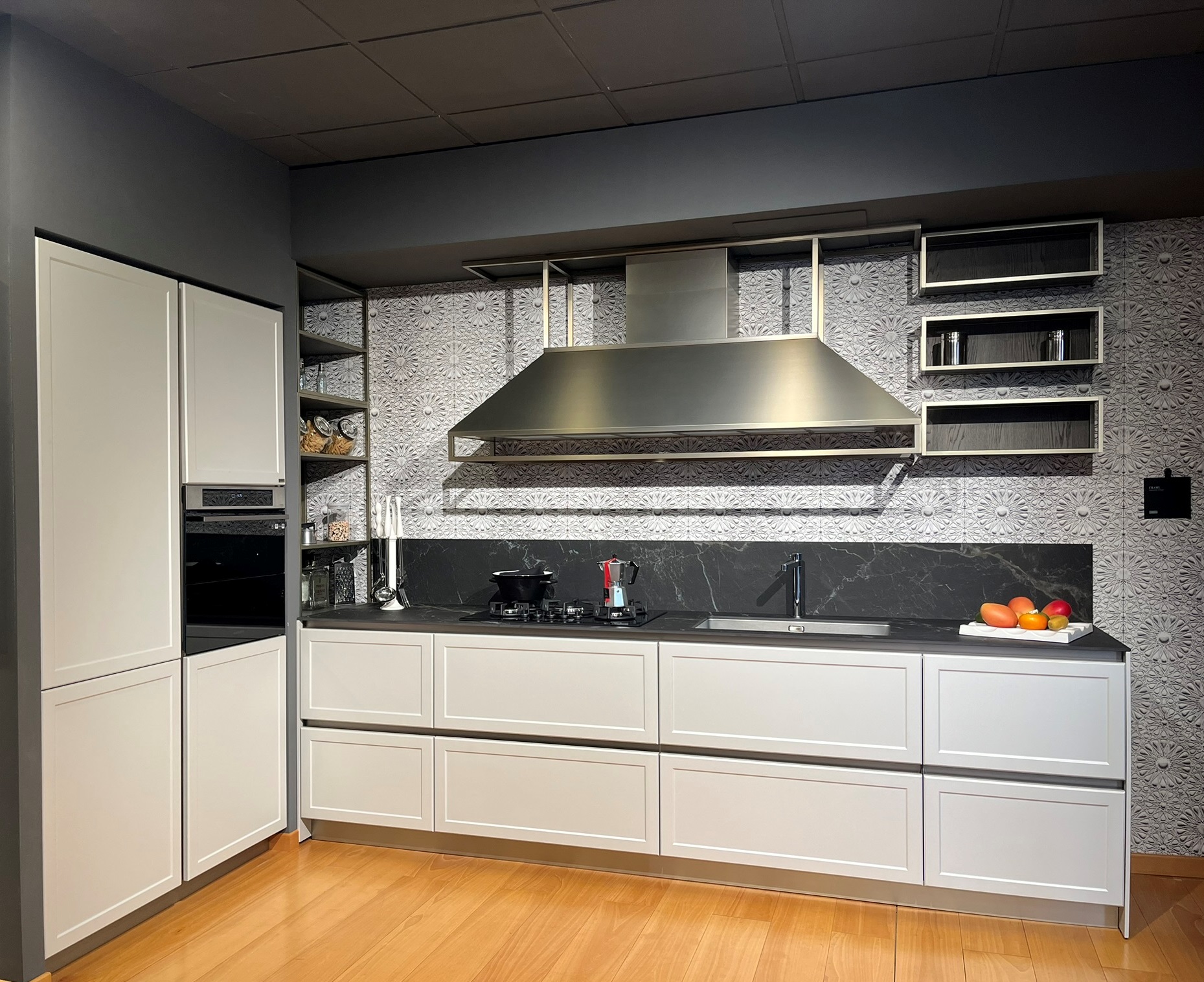 Un progetto di cucina che rappresenta il classico contemporaneo, un design moderno e raffinato, dalle suggestioni vintage ma con contaminazioni industrial chic; un perfetto connubio tra stile e personalità. Il fulcro della cucina è rappresentato dalla struttura in metallo a telaio che ospita la cappa, un elemento centrale del progetto, ma allo stesso tempo professionale dell’ambiente.