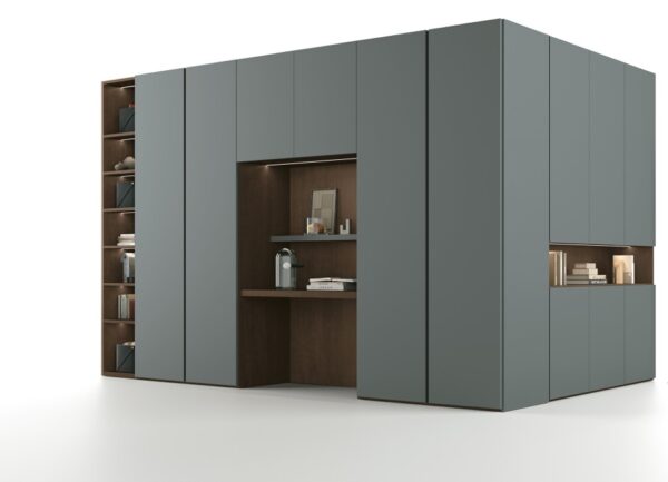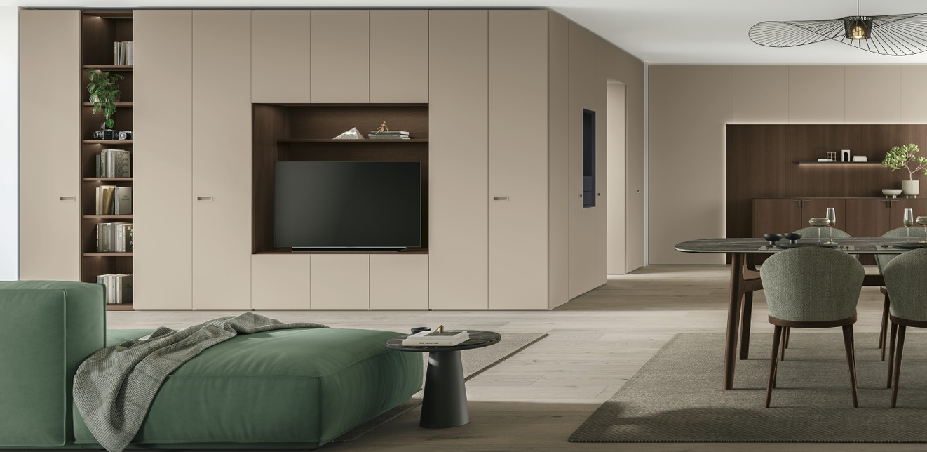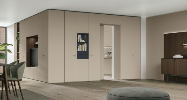 La zona giorno di queste pareti è stata organizzata con un’ armadiatura ad angolo che mette in evidenza il living. Progettata come elemento di continuità architettonica e visiva, la composizione incornicia un vano passante che conduce verso una stanza adiacente, mantenendo la percezione di uno spazio connesso e armonico.