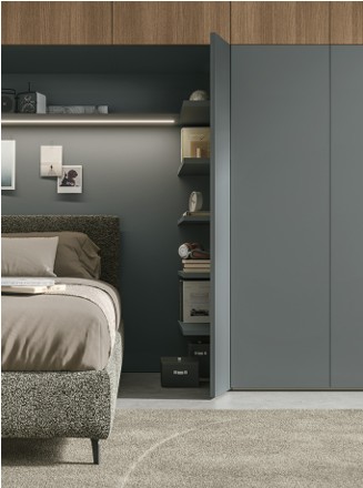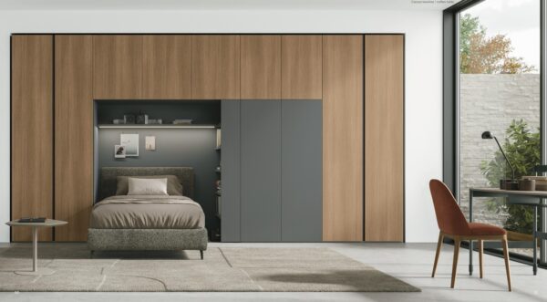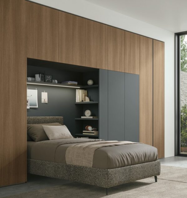 Questa armadiatura a ponte è stata progettata per organizzare al meglio lo spazio per la camera dei ragazzi. Risponde a più esigenze contemporaneamente ottimizzando la superficie disponibile, offrire ampio contenimento e creare una composizione visivamente accattivante. Questa struttura sfrutta lo spazio in altezza sopra il letto e con le colone laterali estende la capacità contenitiva su tutta la parete. Al centro dell’ armadiatura si inserisce una nicchia configurata con una parte a giorno e una chiusa da ante. Il vano aperto accoglie il letto, una mensola con illuminazione integrata e alcuni ripiani che movimentano la composizione e aggiungono funzionalità.